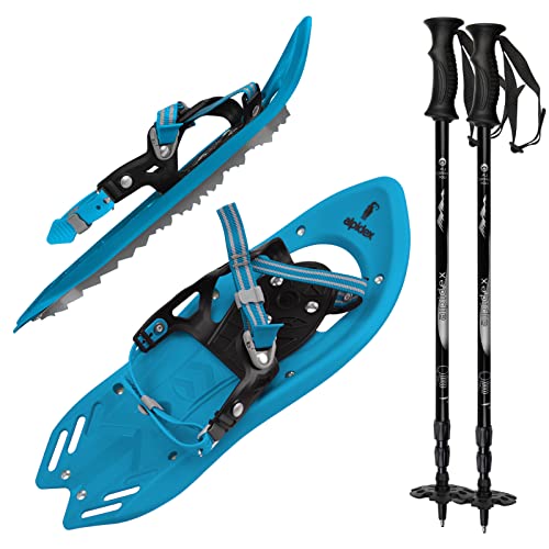 Optional können Sie auch noch Teleskop-Stöcke mit integriertem Schutzsystem in einem Set erhalten. Die Schneeschuhe sind leicht zu tragen und haben einen ergonomischen Griff, der sich ideal für Kinder eignet.Für alle Abenteuer!